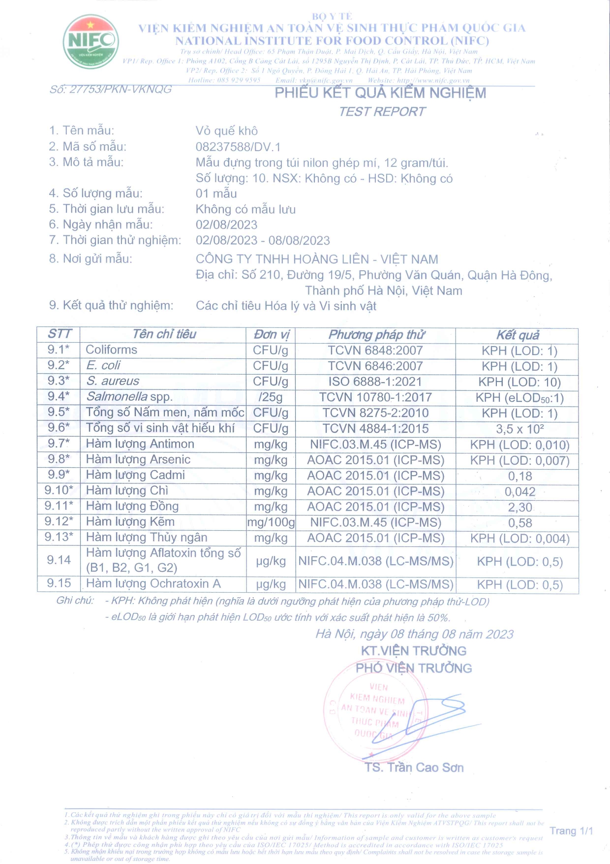 Do file ảnh kiểm nghiệm có dung lượng lớn, vì vậy nếu quý khách muốn xem chi tiết thì vui lòng click vào đây để xem phiếu kiểm nghiệm